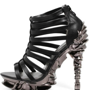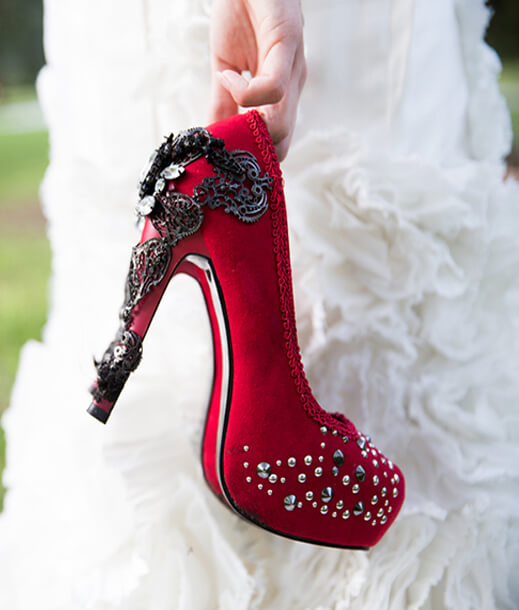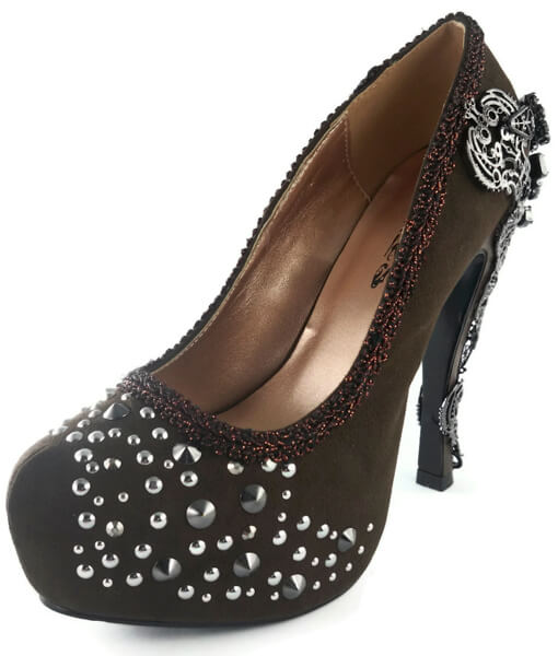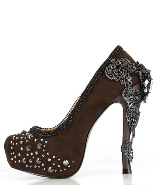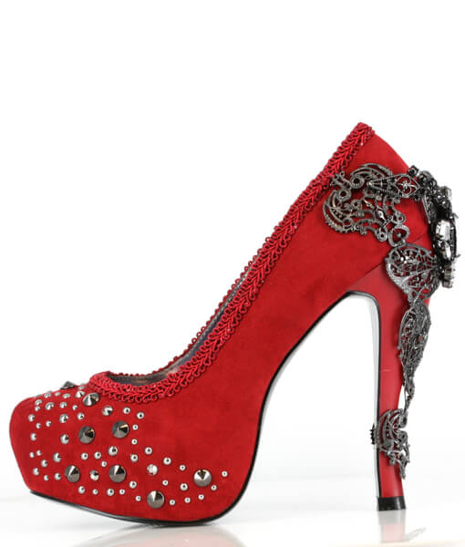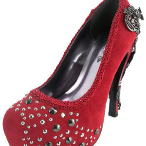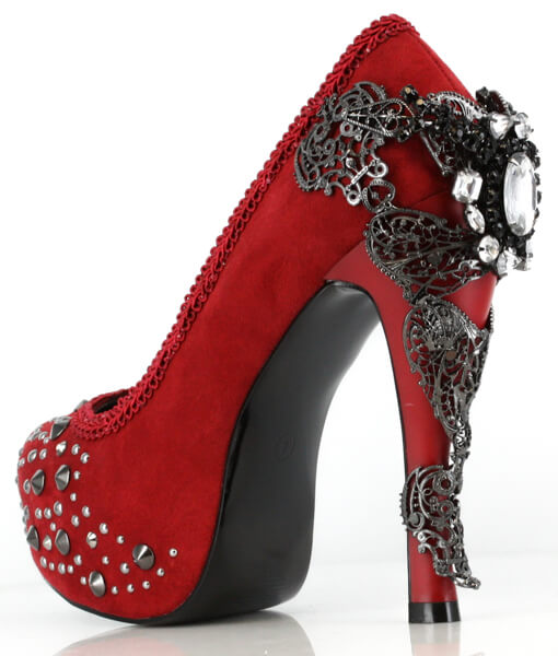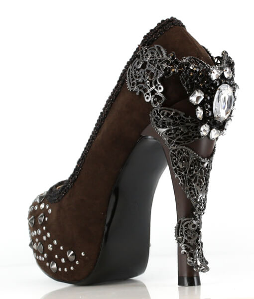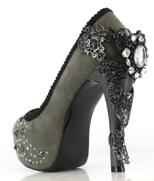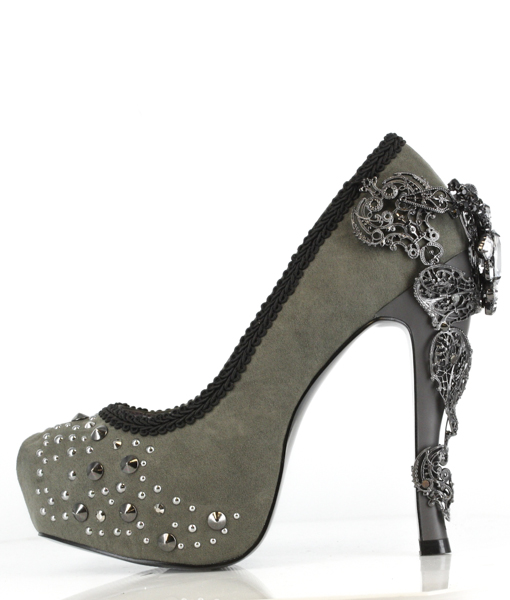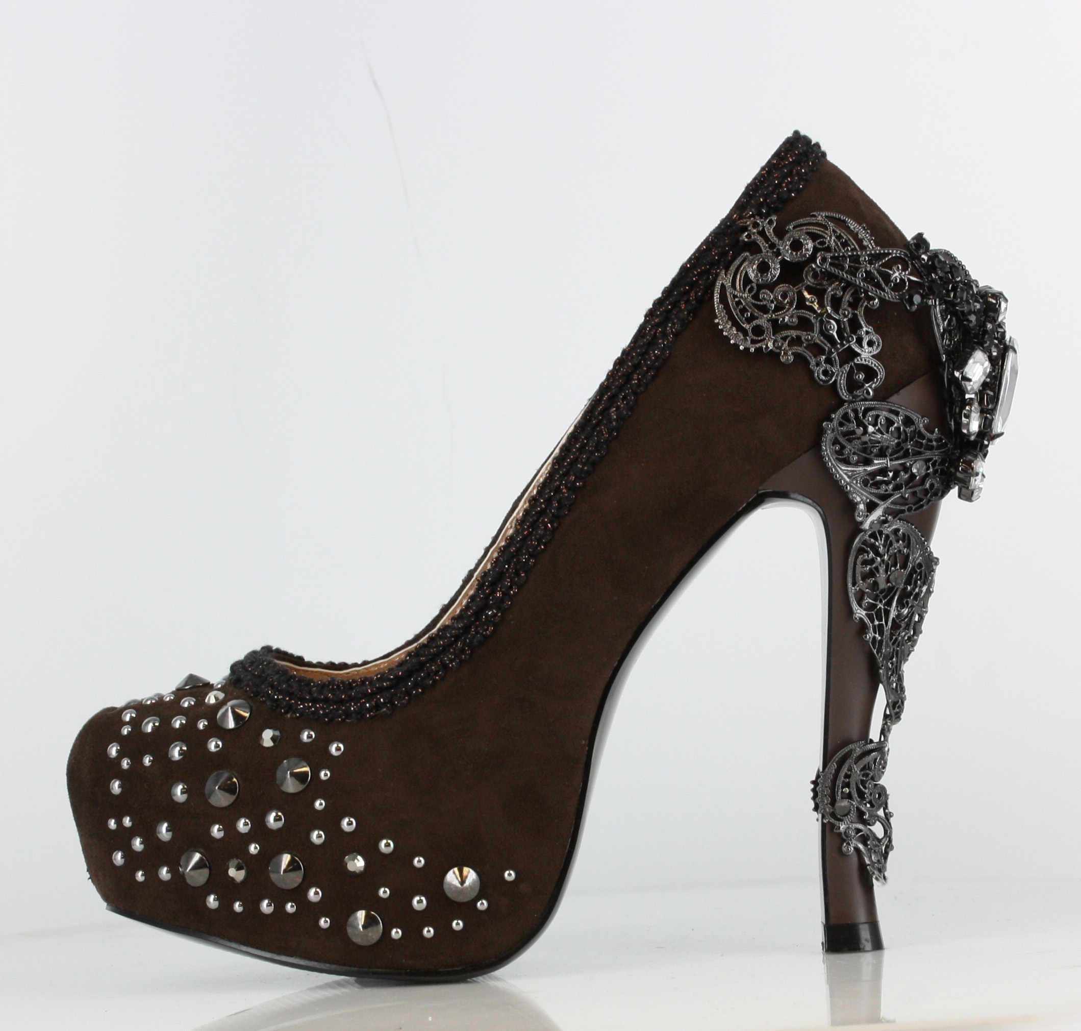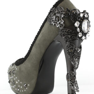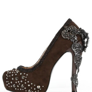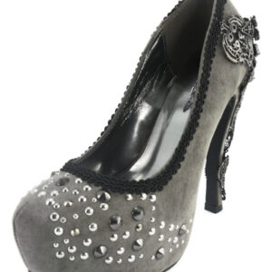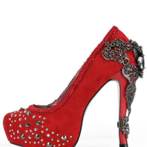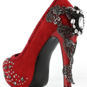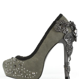 Victorian renaissance themed molded heel w/ mock swarvoski crystals in center. Micro-suede upper w/ inner lining & matching outsole. Assorted mini-pyramid studs mixed with circular metal studs in front area