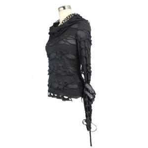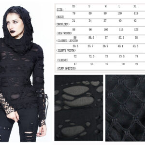 Elastic broken hole knitted fabric Thin and lightweight matching hood Breathable material Cuffs are spliced with mesh and loops stitched, made to look like gloves Custom shabby design for the imperfectionist Size measurement chart included for reference