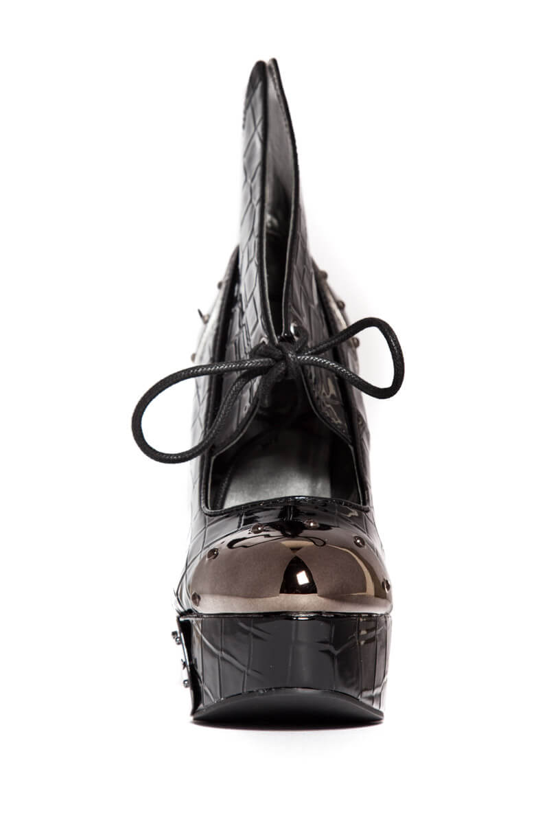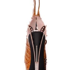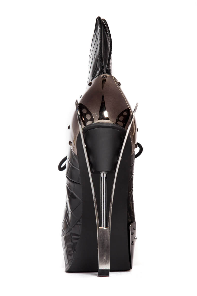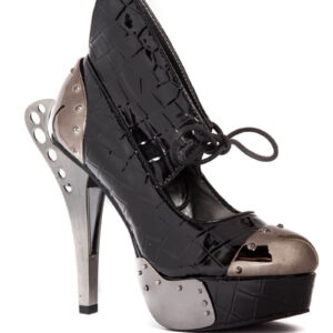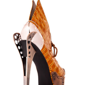 Steampunk inspired. Double sided custom cut metal heel. 1.5″ platform. Matching armor pieces with front metal toe cap. Layered faux snakeskin upper. Adjustable front laces. Available in Orange and Black.