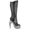 Lace up black high heel platform boot with ornate chain and flame buckle accented with layered heel, studs and spike.