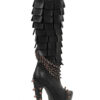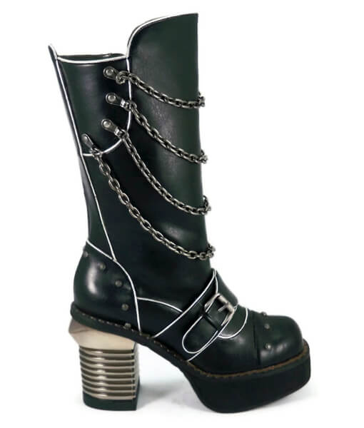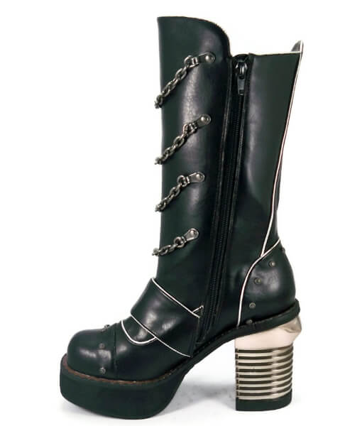 The long awaited chucky heel, under the knee boot has arrived! The heel is 4 inches with a 1.5 inch platform in the front. Adored with metal chains and screw topped rivets. A unique designed metallic styled heel. Buckle strap across the front. Easy access inside zipper. This boot is quite versatile and compliments many an outfit