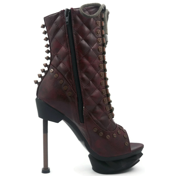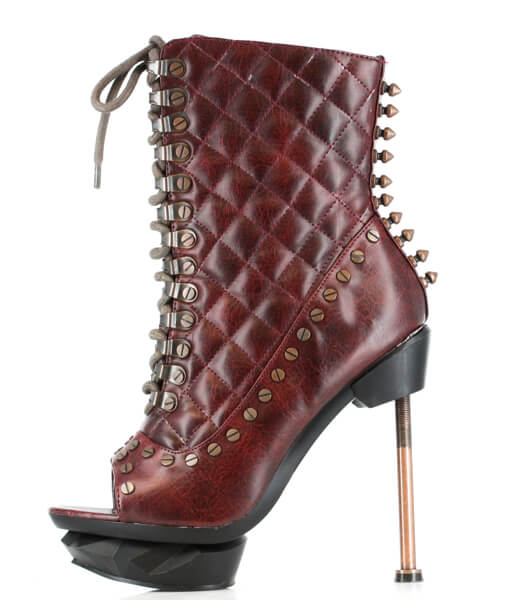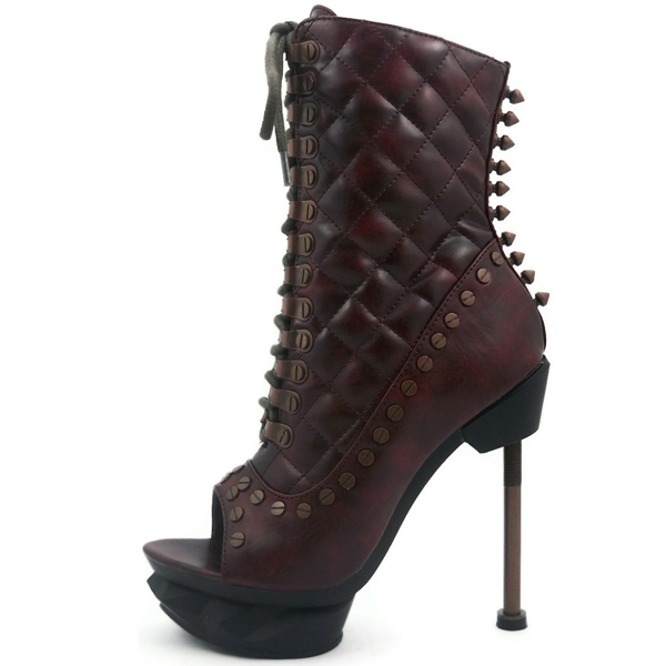 The most astounding Victorian granny boot with a twist of Steampunk ! The quilted stitched boot is ankle high with a machinery rivet eyelets that lace up front, with more rivets on the body of the boot along with some steamy spikes up the back. Heel: 5inches. Custom double platform sole. Available in a luscious burgundy