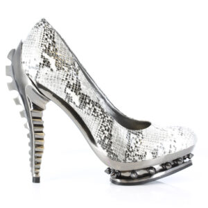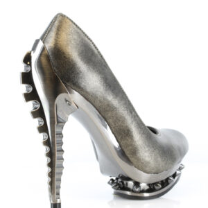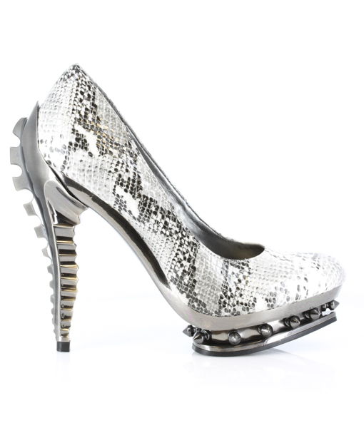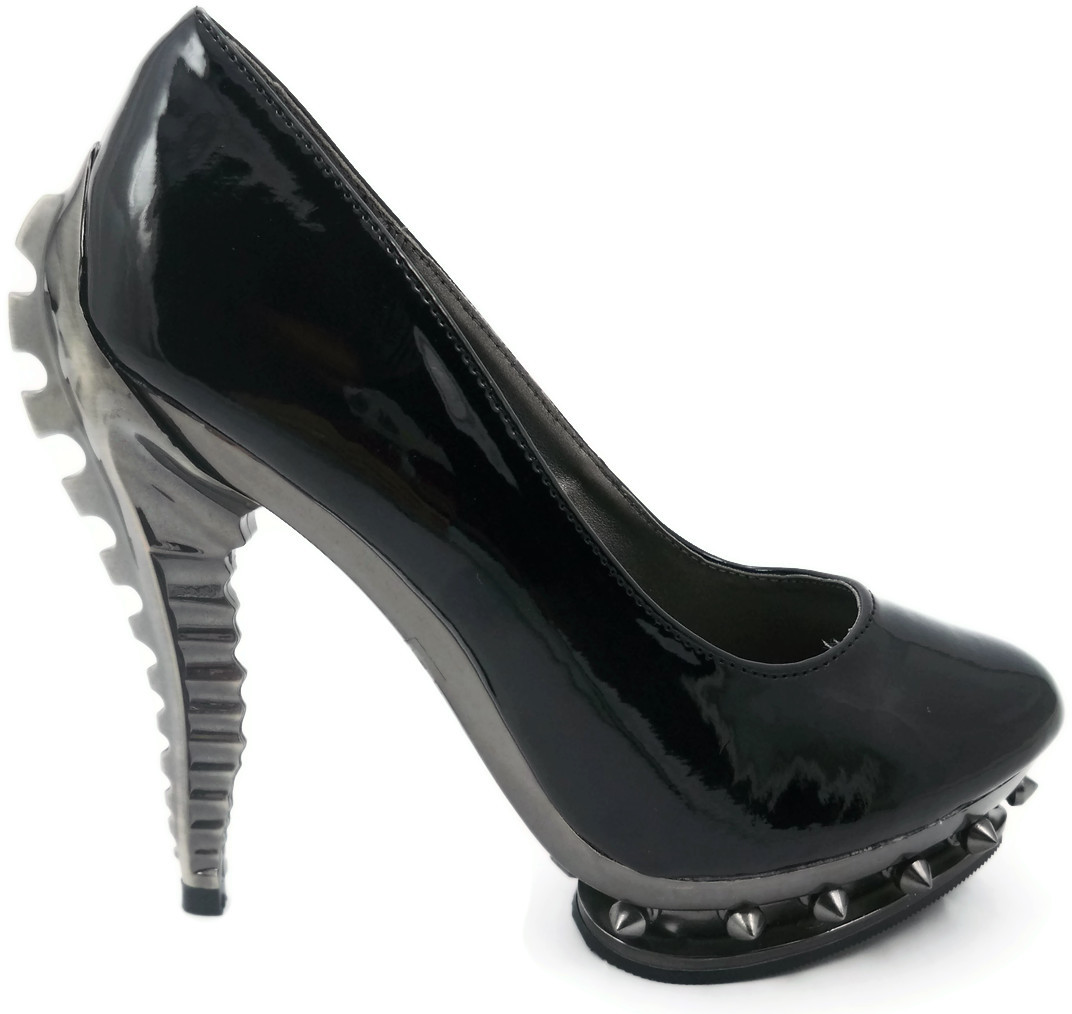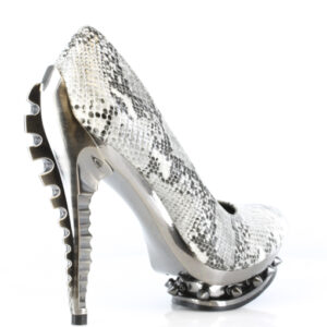 Classic Hades pump. One of our very first designs! Comes in multiple colors. Can be custom made in any color, fabric, material, pattern, synthetic snakeskin, etc. Extra charges will apply for customized patterns. For black, choose between matte black or patent black. Custom molded ABS chrome skeleton heel w/ spiked rivets in double platform.